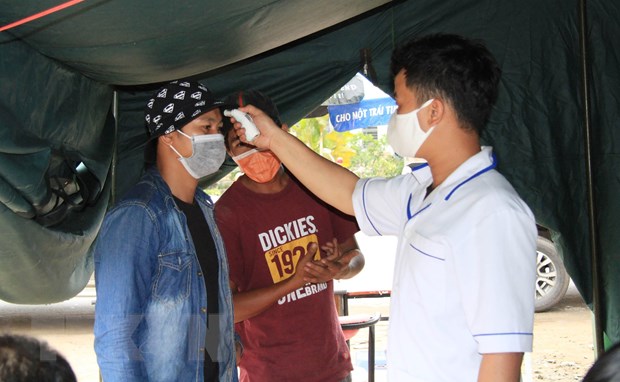 Đo thân nhiệt người điều khiển phương tiện giao thông tại chốt kiểm dịch. (Ảnh: Đặng Tuấn/TTXVN)