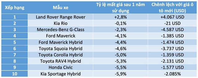 Xếp sau Land Rover Range Rover là 3 mẫu xe sử dụng động cơ đốt trong gồm Kia Rio (mất giá khoảng 0,1%); Mercedes-Benz G-Class (-2,3%) và Ford Maverick (-4,1%)./.