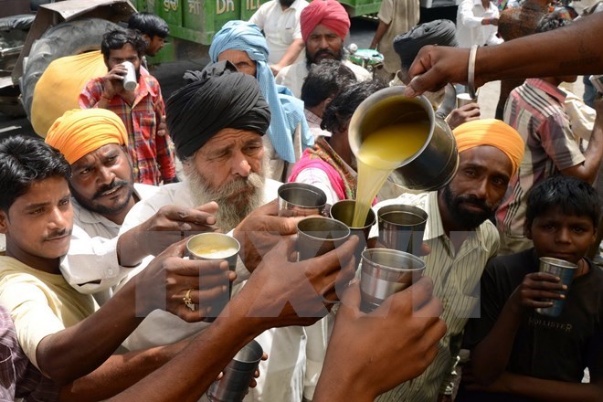 Tình nguyện viên phát nước hoa quả miễn phí cho người đi đường nhằm giải nhiệt khi nắng nóng hoành hành tại Amritsar ngày 29/5. (Nguồn: AFP/TTXVN)