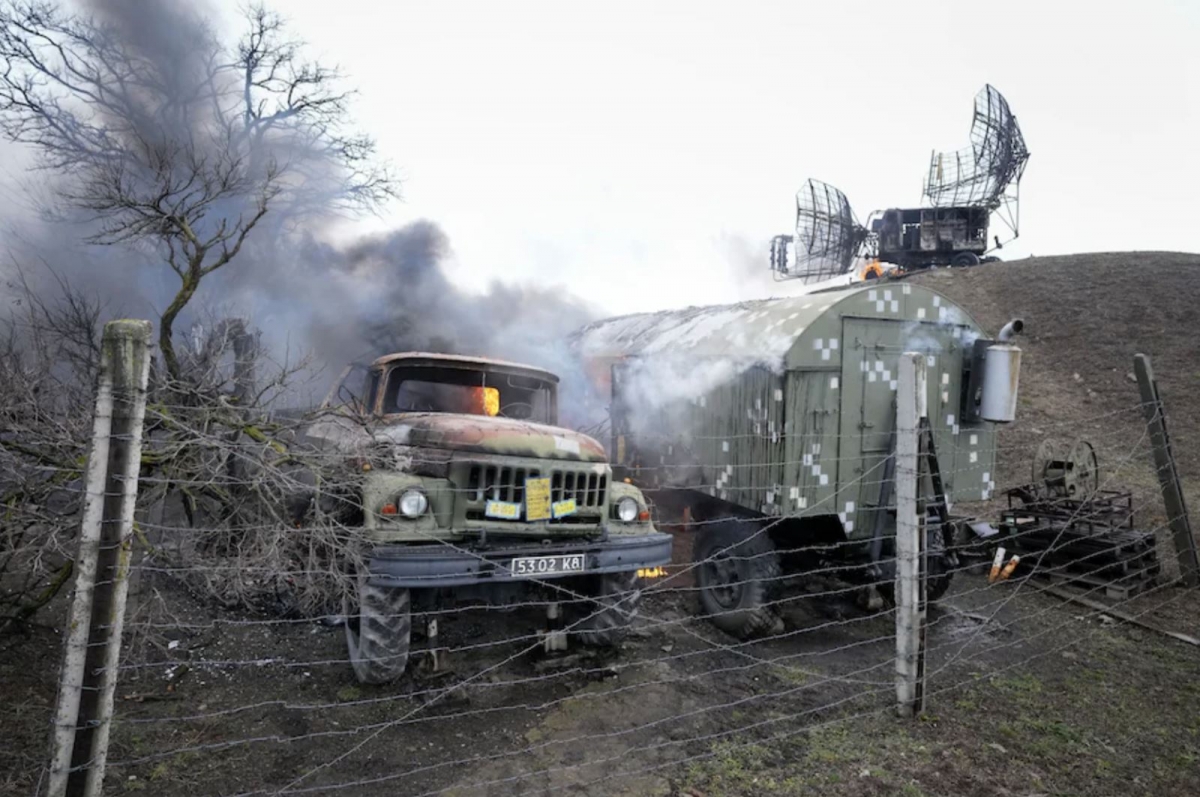 Radar và thiết bị quân sự bị phá huỷ tại căn cứ Ukraine ở ngoại ô thành phố Mariupol ngày 24/2/2022. Ảnh: AP