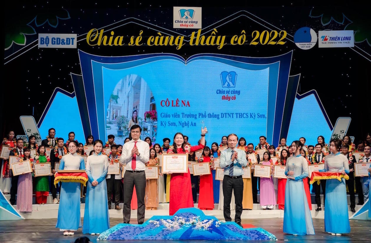 | Ủy viên Trung ương Đảng, Phó Trưởng Ban thường trực Ban Dân vận Trung ương Phạm Tất Thắng (phải) và Ủy viên dự khuyết Trung ương Đảng, Bí thư thứ nhất Trung ương Đoàn Bùi Quang Huy trao Bằng khen và biểu trưng của chương trình “Chia sẻ cùng thầy cô” năm 2022 cho cô Lê Na. |