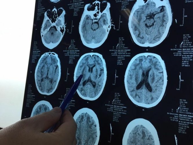 Phim chụp cắt lớp nhiều điểm tổn thương ở não người bệnh 52 tuổi ngộ độc methanol - Ảnh: Thúy Anh