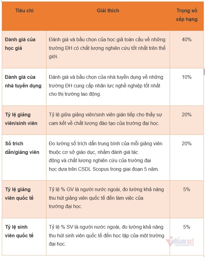 Tiêu chí xếp hạng của QS nhấn mạnh vào đóng góp và tác động của chất lượng đào tạo và nghiên cứu của trường đại học đối với xã hội (thông qua đánh giá của doanh nghiệp, học giả trong và ngoài nước) và các đóng góp cho hoạt động nghiên cứu khoa học (thông qua số trích dẫn/giảng viên)./.