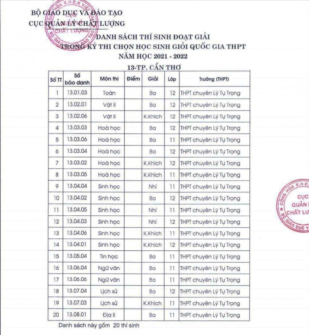 (CT)- Bộ Giáo dục và Đào tạo vừa thông báo kết quả Kỳ thi chọn học sinh giỏi quốc gia THPT năm học 2021-2022.