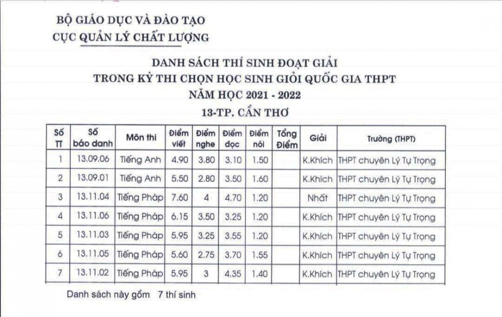 Riêng TP Cần Thơ, có 27 học sinh (trong số 62 thí sinh dự thi) đạt giải; trong đó có 1 giải Nhất môn tiếng Pháp, 3 giải Nhì, 11 giải Ba và 12 giải Khuyến khích.