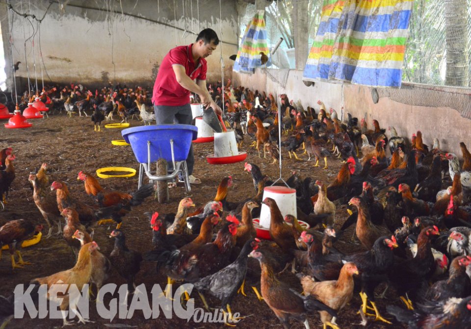 Nông dân xã Thạnh Đông, huyện Tân Hiệp (Kiên Giang) chăm sóc đàn gà thương phẩm. Ảnh: BÍCH LINH