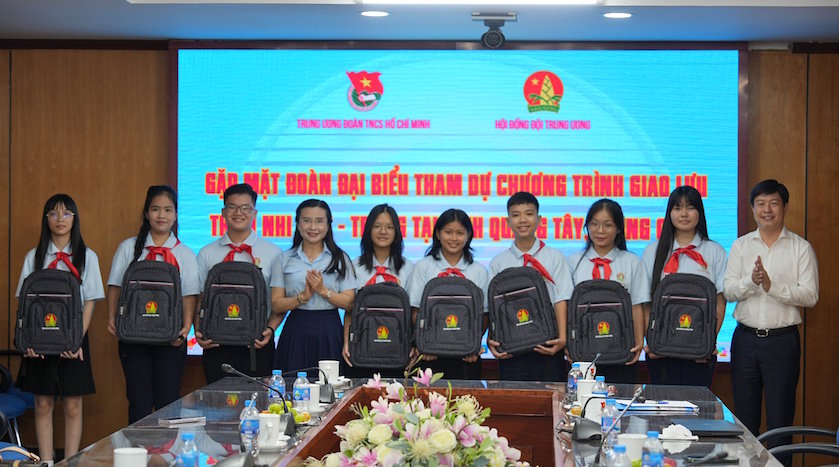 | Bí thư Trung ương Đoàn, Chủ tịch Hội đồng Đội Trung ương Nguyễn Phạm Duy Trang và Trưởng ban Công tác thiếu nhi, Phó chủ tịch thường trực Hội đồng Đội Trung ương Lê Hải Long trao quà cho đại biểu dự Giao lưu thiếu nhi Việt - Trung năm 2024. |
