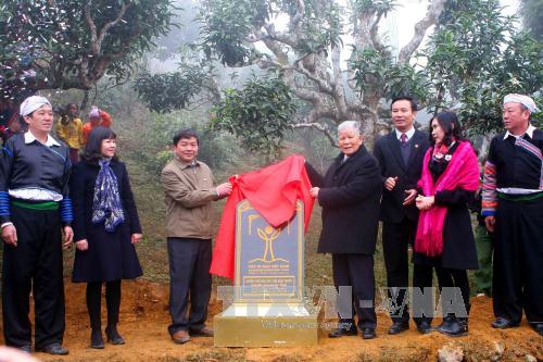 Đặt bia công nhận Cây di sản Việt Nam đối với quần thể 400 cây chè shan tại xã Suối Giàng. Ảnh: Thế Duyệt - TTXVN