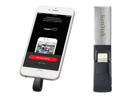 Nó sẽ tự động sao lưu ảnh của bạn, cho phép bạn di chuyển bất kỳ tập tin nào vào/ ra khỏi điện thoại và hỗ trợ chuẩn USB 3.0. Đặc biệt là nó cũng có một cổng USB để chép dữ liệu từ ổ đĩa này tới bất kỳ thiết bị nào, cho dù thiết bị đó không có cổng Lightning. SanDisk iXpand Flash Drive có 3 mức dung lượng: 32 GB, 64 GB và 128 GB, với giá khởi điểm khoảng 36 USD.