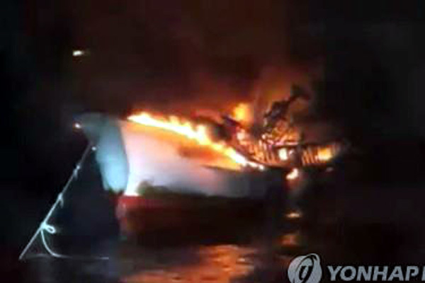 | Tàu bị bốc cháy vào rạng sáng nay. Ảnh Yonhap News |