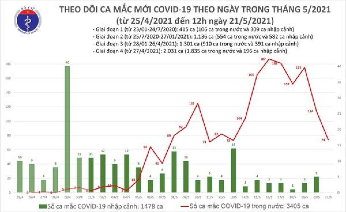 Tính đến 12h ngày 21/5, Việt Nam có tổng cộng 3.405 ca ghi nhận trong nước và 1.478 ca nhập cảnh. Số ca mắc mới tính từ ngày 27/4 đến nay là 1.835 người.