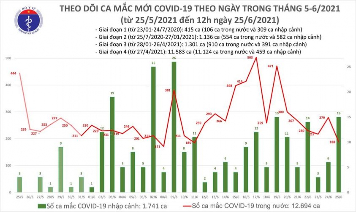 Tính từ 6-12h ngày 25/6, Việt Nam có 112 ca mắc COVID-19 mới, gồm 3 ca cách ly ngay sau khi nhập cảnh tại Kiên Giang (1), Quảng Ninh (1), An Giang (1) và 109 ca ghi nhận trong nước tại TP.HCM (50), Long An (21), Bắc Giang (18), Bình Dương (12), Hưng Yên (3), Phú Yên (2), Bắc Ninh (2), Quảng Ninh (1); trong đó 106 ca được phát hiện trong khu cách ly hoặc khu đã được phong toả.