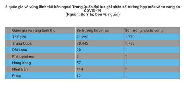 Đến 6 giờ 30 phút sáng nay tổng số trường hợp mắc bệnh COVID-19 trên toàn thế giới là 71.223 trường hợp, trong đó tại Trung Quốc đại lục: 70.442 người.