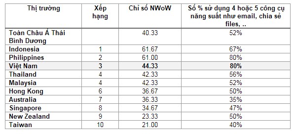 Ngoài ra, 80% phản hồi từ Việt nam sử dụng tối thiểu 4 hoặc 5 dịch vụ trực tuyến để giúp xử lý công việc như email, mạng xã hội, hợp tác, hội thảo trực tuyến, chia sẻ trực tuyến… Con số này cao hơn mức bình quân của thị trường châu Á - Thái Bình Dương (52%)...