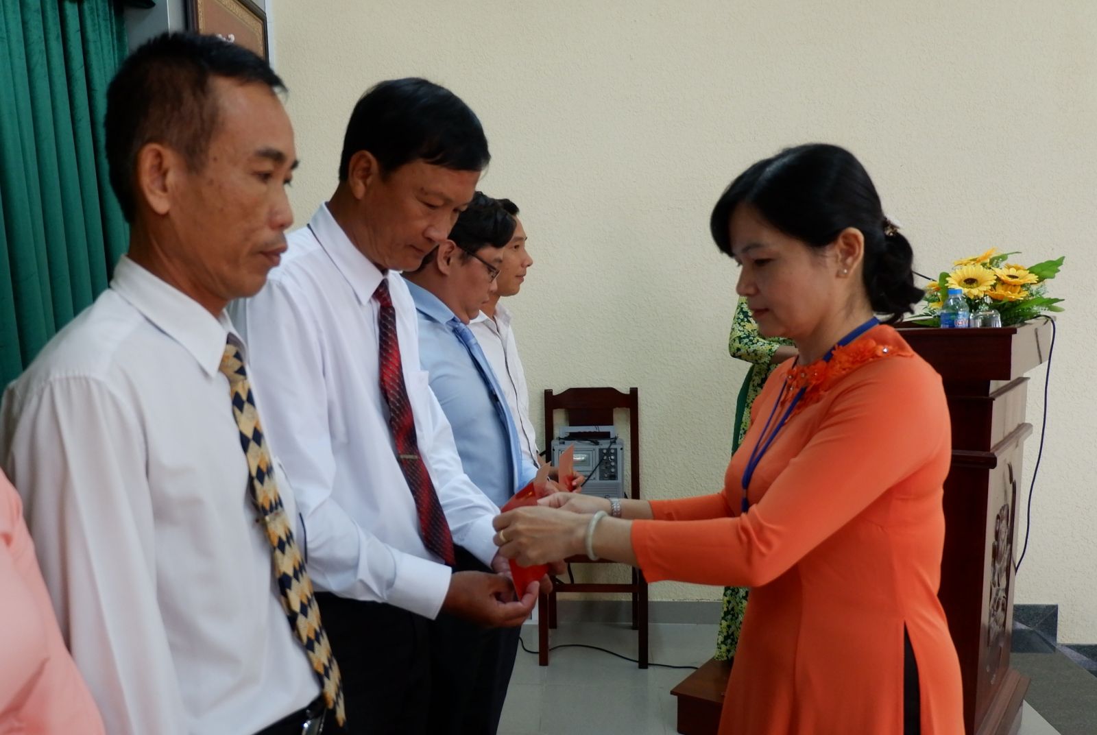 Phó Hiệu trưởng Trường Chính trị tỉnh Long An – Phan Thị Xuân Lan trao giấy khen cho 1 học viên đạt loại giỏi.