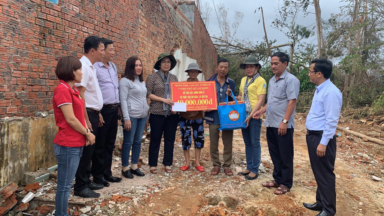 | Đồng chí Tô Thị Bích Châu, Chủ tịch Ủy ban MTTQ Việt Nam TP. Hồ Chí Minh đã tới thăm và tặng quà cho các gia đình bị thiệt hại do thiên tai tại khu vực miền Trung. |