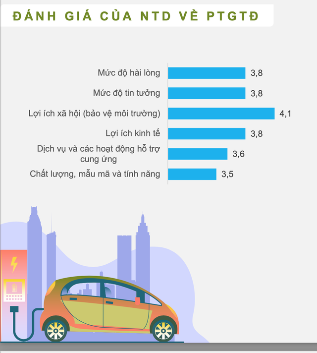 Theo ông Hoàng Đình Trọng, với thang điểm tối đa là 5 nhưng nhiều chỉ số chưa đạt được 4 điểm cho thấy các loại xe điện cần tiếp tục cải tiến để đáp ứng nhu cầu của NTD
