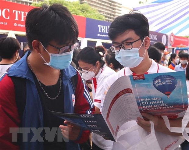 Học sinh tìm hiểu thông tin tuyển sinh của các trường Đại học. (Ảnh: Nguyễn Thùy Dương/TTXVN phát)