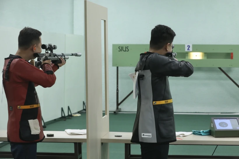 Các vận động viên thi đấu nội dung 10m súng trường hơi di động hỗn hợp nam. (Ảnh: Minh Quyết/TTXVN)