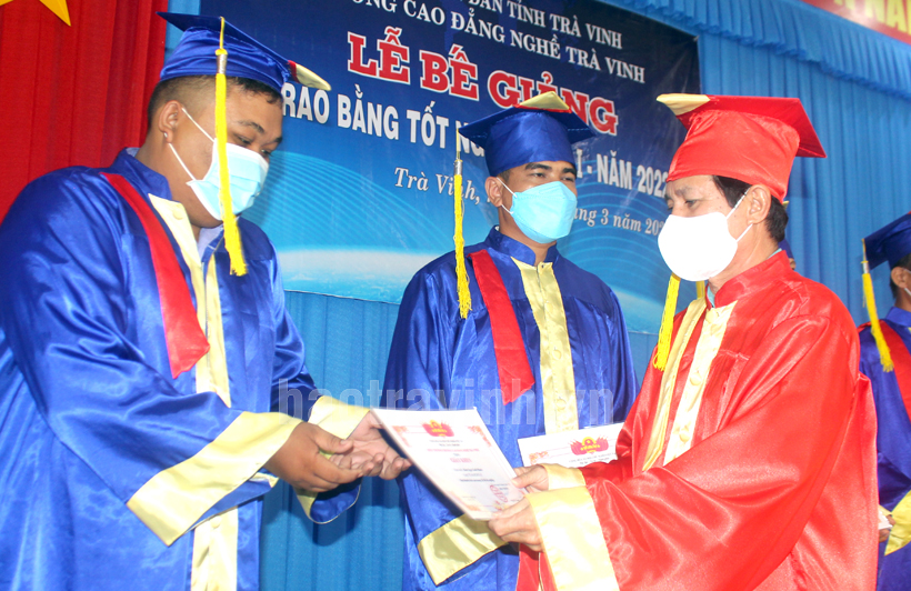 Thầy Cao Minh Trận, Phó Hiệu trưởng Trường Cao đẳng Nghề Trà Vinh trao giấy khen cho những học sinh, sinh viên đạt loại giỏi.