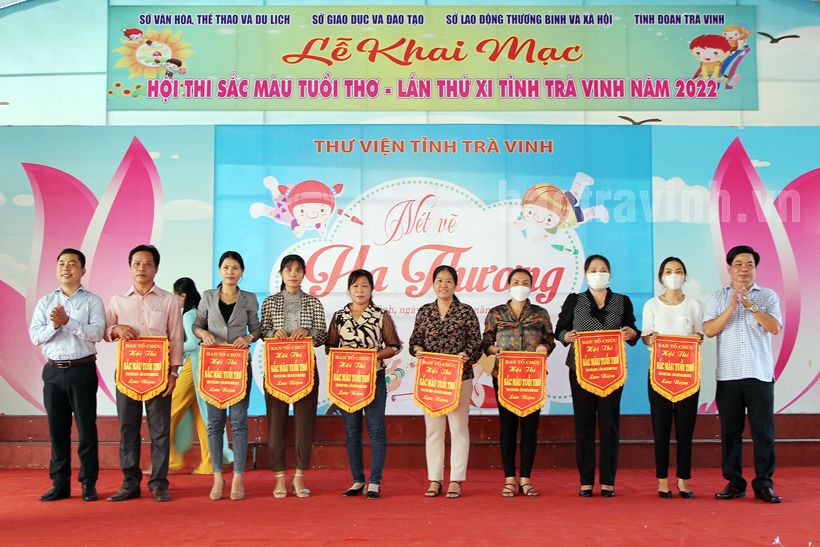 Lãnh đạo Sở Văn hóa, Thể thao và Du lịch và Tỉnh Đoàn Trà Vinh trao cờ lưu niệm cho các đơn vị tham gia hội thi.