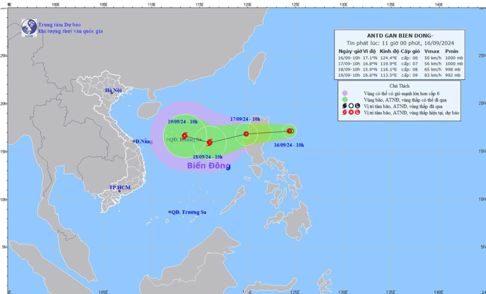 Cụ thể, hồi 13 giờ ngày 16/9, vị trí tâm áp thấp nhiệt đới ở vào khoảng 17,1 độ Vĩ Bắc; 123,9 độ Kinh Đông, trên vùng biển phía Đông đảo Lu Dông (Philippines). Sức gió mạnh nhất vùng gần tâm áp thấp nhiệt đới mạnh cấp 6-7 (39-61km/h), giật cấp 9; di chuyển chủ yếu theo hướng Tây khoảng 15km/h.