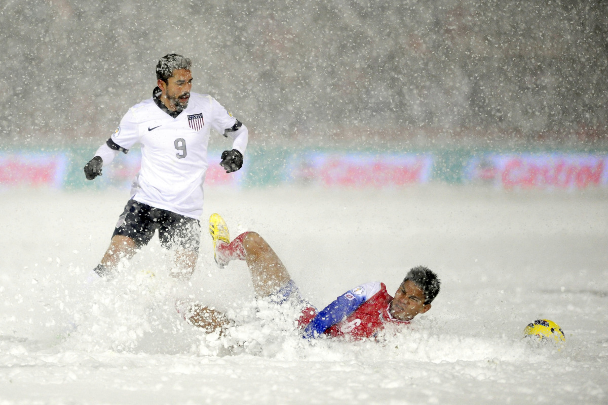 Cầu thủ ngập trong tuyết ở trận Mỹ thắng Costa Rica. Ảnh: Forthewin