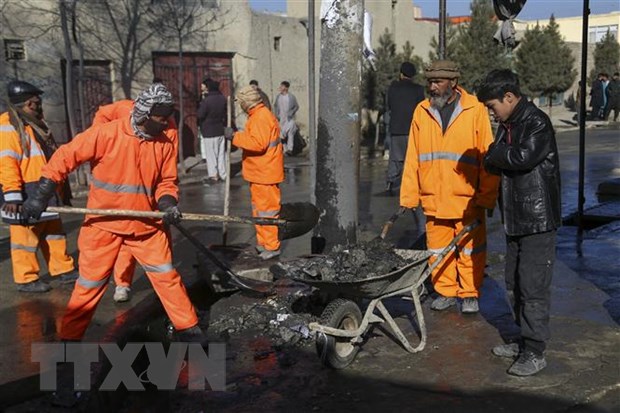 Lực lượng chức năng khắc phục hậu quả tại hiện trường vụ nổ bom ở Kabul, Afghanistan ngày 22/12/2020. (Ảnh: AFP/TTXVN)