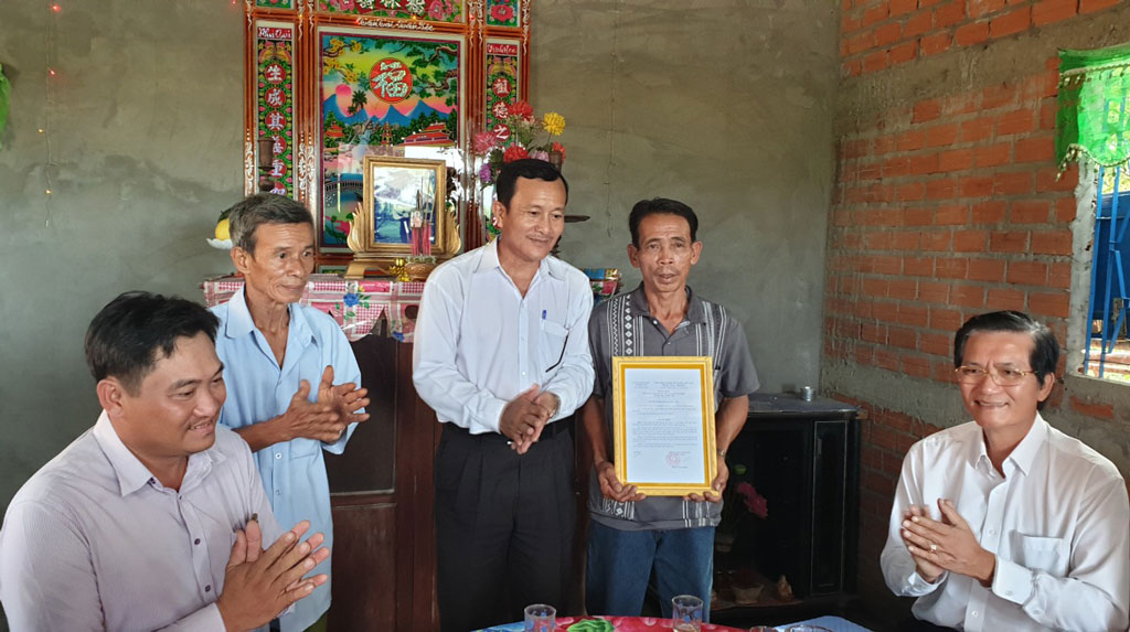 Chủ tịch UBND xã Đức Tân - Huỳnh Văn Nhanh trao quyết định tặng nhà tình thương cho gia đình ông Lê Văn Răng