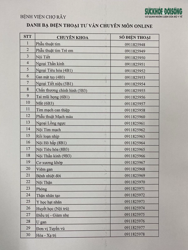 Nhằm giúp bệnh nhân ổn định tinh thần, để thân nhân bệnh nhân có thể tự chăm sóc sức khỏe cho người thân theo từng bệnh lý đặc thù, đồng thời phát hiện kịp thời các dấu hiệu bất thường của bệnh, tránh tình trạng đưa bệnh nhân đến cấp cứu trong những tình huống không cần thiết, dẫn đến nguy cơ lây nhiễm COVID-19 nhưng cũng không để bệnh nhân trở nặng mới đưa đến bệnh viện làm lỡ thời gian vàng điều trị cho bệnh nhân… BV Chợ Rẫy đưa vào hoạt động 30 số điện thoại di động chuyên tư vấn khám bệnh online qua điện thoại cho bệnh nhân không phải là bệnh nhân COVID-19.
