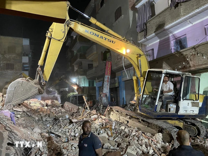 Lực lượng cứu hộ tìm kiếm nạn nhân tại hiện trường vụ sập nhà ở Ai Cập. (Ảnh: AA/TTXVN)