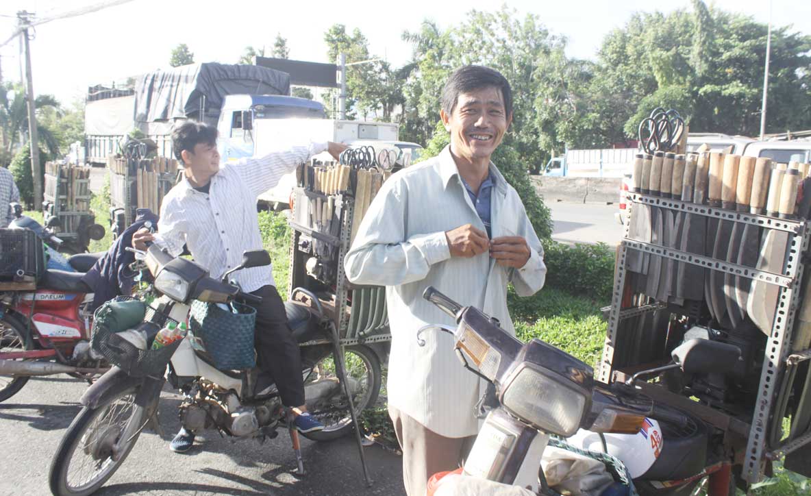 Không biết tự khi nào, người dân đã quen với hình ảnh những xe mài dao, kéo thỉnh thoảng chạy qua ngõ nhà mình. Một chiếc xe máy chở theo máy mài dao, mấy bộ dao, kéo mới là tất cả “cơ nghiệp” của những người thợ mài dao, kéo dạo. Các anh rời quê, từ miền Trung vào Long An, ở trọ tại thị trấn Bến Lức, huyện Bến Lức và cùng làm nghề mài dao, kéo. Người đến trước hướng dẫn người đến sau, cứ thế, mỗi người một ngả đường, ngày đi, đêm nghỉ, không ai “giẫm chân” ai. Anh Năm Nga, một thợ mài dao có hơn 10 năm kinh nghiệm, chia sẻ: “Có ngày, tôi chạy xe hơn 200km, cứ có đường là đi. Chúng tôi, có người vào khu dân cư, xóm, ấp, có người chuyên mài dao trong chợ nên không ai ảnh hưởng đến ai”.