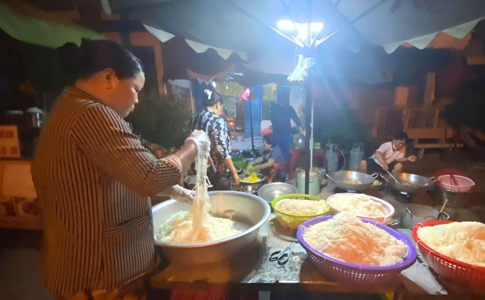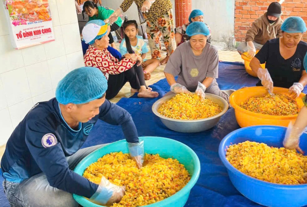 Vào ngày 14 Âm lịch hàng tháng, bếp lại rộn ràng hơn bao giờ hết. Các thành viên tất bật chuẩn bị hàng trăm suất ăn chay miễn phí. Người góp công, người góp của, từ tiền mặt đến rau, củ, bún, gạo,... ai nấy đều chung tay vì một bữa cơm trọn vẹn.