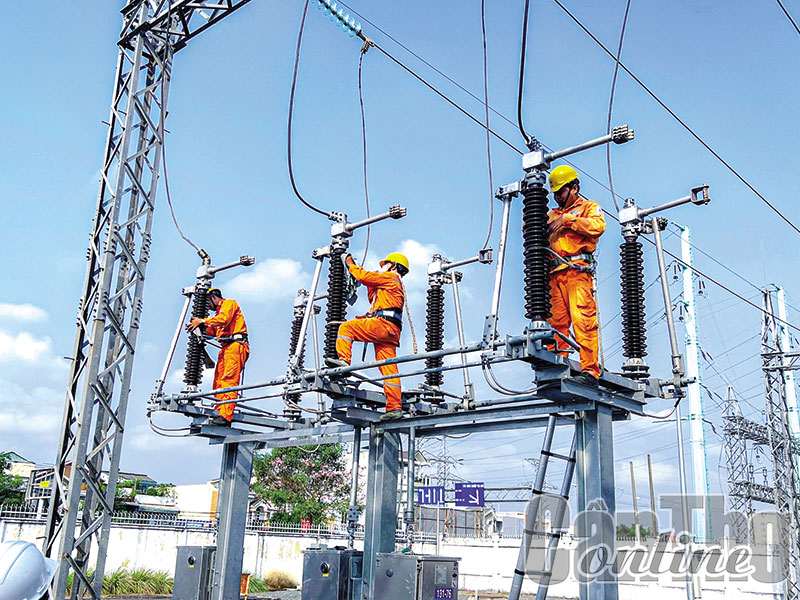Công nhân Công ty Ðiện lực TP Cần Thơ thực hiện công tác sửa chữa, bảo dưỡng một trạm biến áp trên địa bàn phường Trà Nóc, quận Bình Thủy.