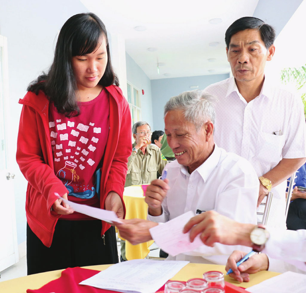 Ông Nguyễn Văn Triều (giữa) kiểm tra một số thông tin để chuẩn bị phát quà cho người có hoàn cảnh khó khăn