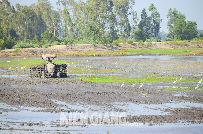 Nông dân ấp Tây Sơn 3, xã Đông Yên, huyện An Biên làm đất chuẩn bị gieo sạ lúa. Ảnh: THANH NHÃ
