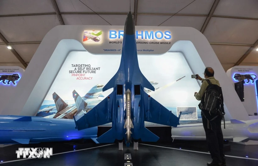 Tên lửa BrahMos được trưng bày tại một cuộc Triển lãm quốc phòng ở Chennai, Ấn Độ. (Ảnh: AFP/TTXVN)