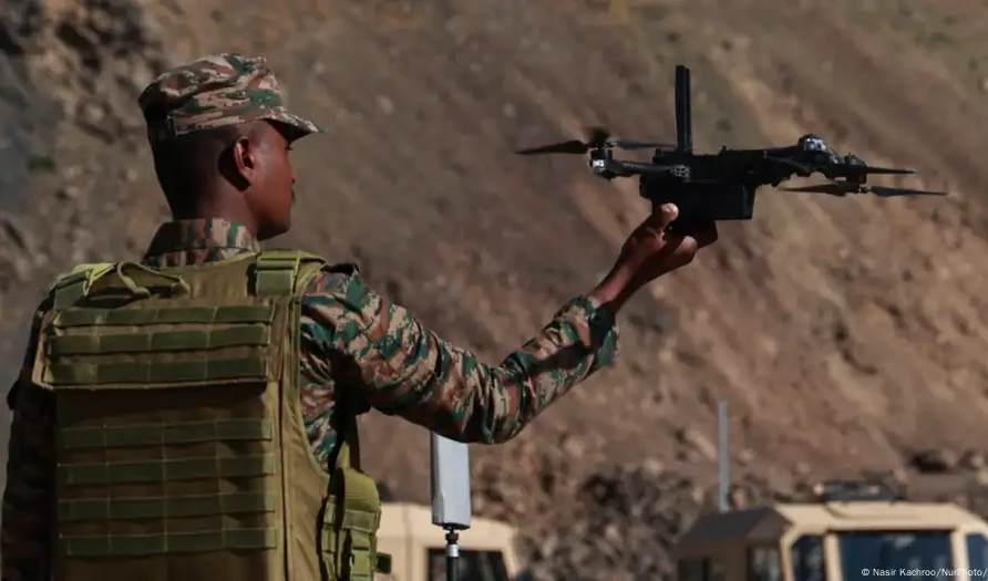 Binh sĩ Ấn Độ với chiếc UAV trên tay. Ảnh: DW