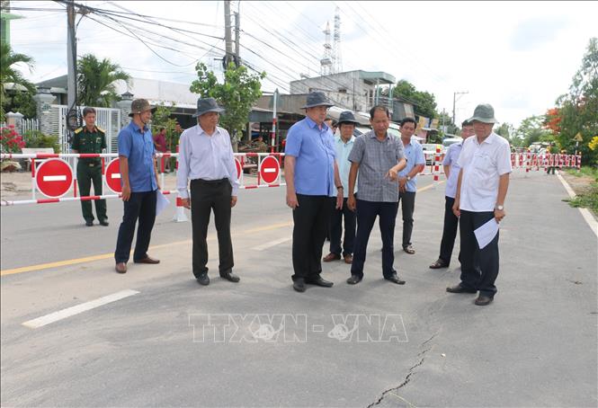 | Chủ tịch UBND tỉnh An Giang Nguyễn Thanh Bình cùng đoàn công tác khảo sát thực tế khu vực xuất hiện các vết rạn nứt, nguy cơ sạt lở Quốc lộ 91, đoạn qua ấp Bình Tân, xã Bình Mỹ, huyện Châu Phú. |