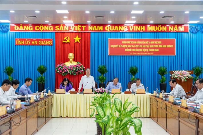 Với báo cáo tổng kết 10 năm thực hiện Nghị quyết 29 của tỉnh An Giang, Bộ trưởng đề nghị cần bổ sung, phân tích làm rõ góc độ tài chính, đầu tư cho giáo dục; nhấn mạnh thêm nội dung về giáo dục dân tộc; giáo dục mầm non, đặc biệt là tỷ lệ huy động trẻ, nhà trẻ đến trường; bổ sung phù hợp các kết quả về chuyên môn giáo dục vì đây là hồn cốt đổi mới.