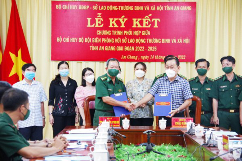 | Lãnh đạo Bộ Chỉ huy Bộ đội Biên phòng và Sở Lao động - Thương binh và Xã hội tỉnh An Giang ký kết Chương trình phối hợp công tác giai đoạn 2022 - 2025. |