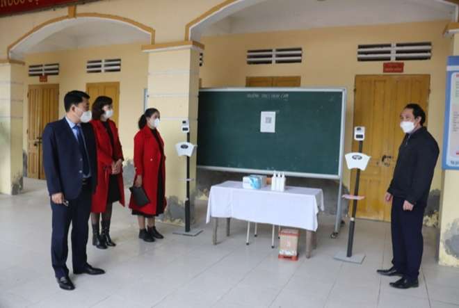 | Đồng chí Nguyễn Mạnh Huy (thứ nhất, trái sang), Phó Chủ tịch UBND huyện Phú Xuyên, thành phố Hà Nội đi kiểm tra công tác chuẩn bị đón học sinh trở lại trường học. (Ảnh: NM). |