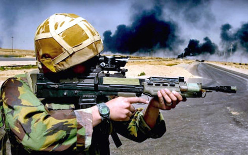 Một binh sỹ thuộc Lữ đoàn thiết giáp số 7 tuần tra gần Basra, Iraq hồi năm 2003. (Ảnh: Reuters)