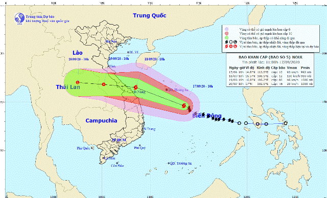 | Dự báo hướng đi của cơn bão số 5 (Ảnh:Trung tâm khí tượng thủy văn Trung ương) |