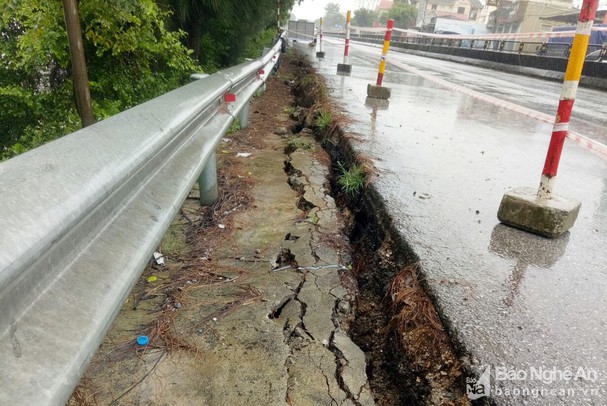 | Dọc Quốc lộ 1, đoạn qua xã Diễn Ngọc, huyện Diễn Châu, tỉnh Nghệ An xuất hiện tình trạng sụt lún (Nguồn ảnh: baonghean.vn) |