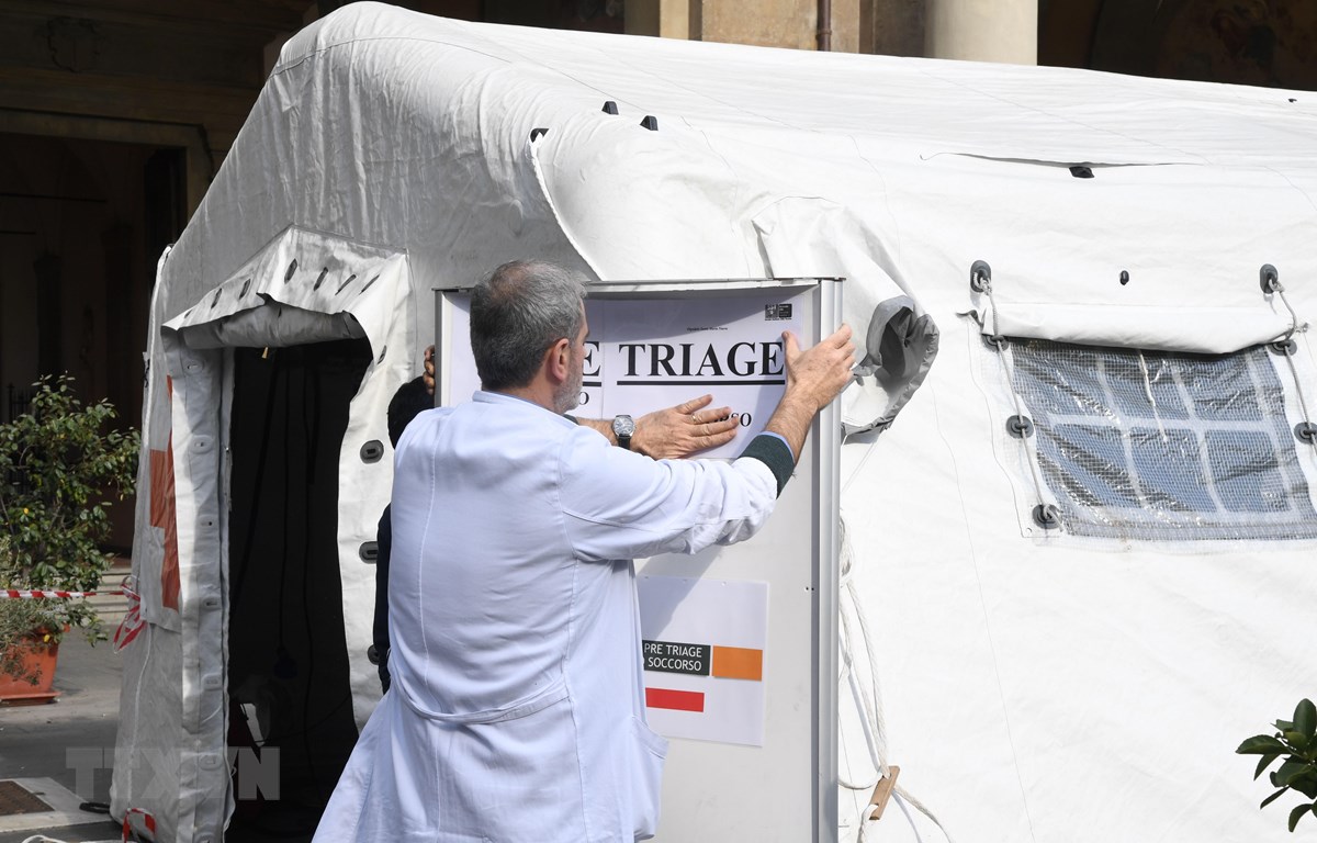 Nhân viên y tế kiểm tra một khu cách ly tạm thời dành cho bệnh nhân nhiễm COVID-19 tại bệnh viện ở Florence, Italy, ngày 25/2. (Ảnh: AFP/TTXVN)