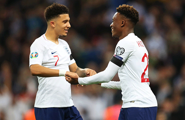 Sancho (trái) và Hudson-Odoi trong màu áo tuyển Anh thi đấu ở vòng loại EURO 2020. Ảnh: Guardian