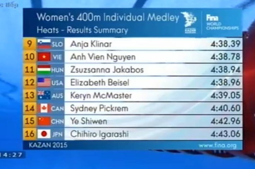 Ánh Viên xếp thứ 10 ở đợt bơi vòng loại. Ảnh chụp từ màn hình