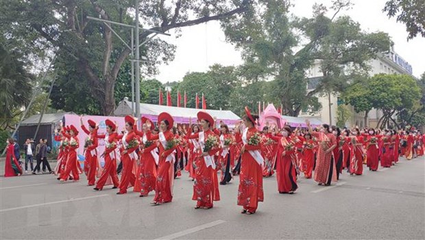 Diễu hành tại Lễ hội Áo dài ''Hương sắc Tràng An''. (Ảnh: Nguyễn Cúc/TTXVN)