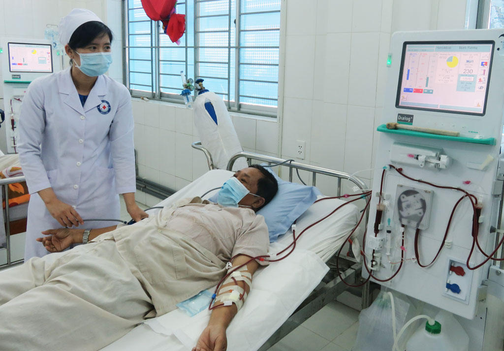 Ông Nguyễn Văn Chưởng được bác sĩ chăm sóc sức khỏe trong quá trình thực hiện chạy thận nhân tạo